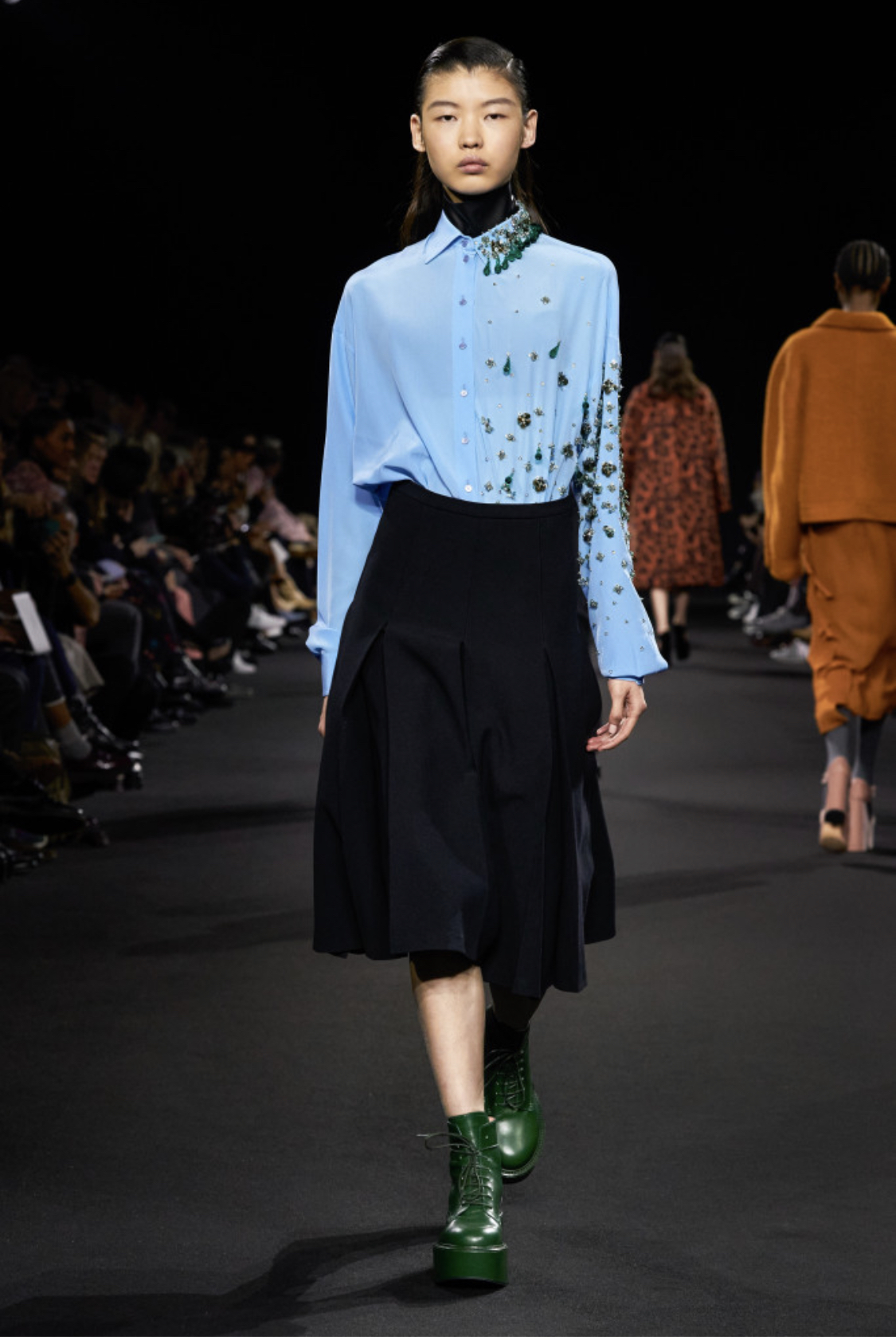 이번 로샤스 컬렉션은 정말 색감이 다했다는 느낌이 들기에 충분할만큼 매혹적인 컬러의 향연이였어요. 하늘색도 어쩜 저리 고급스럽게 표현했는지... 보석 달린 블라우스와 블랙 스커트 조합 엄청 지적이면서 세련됐네요^^
