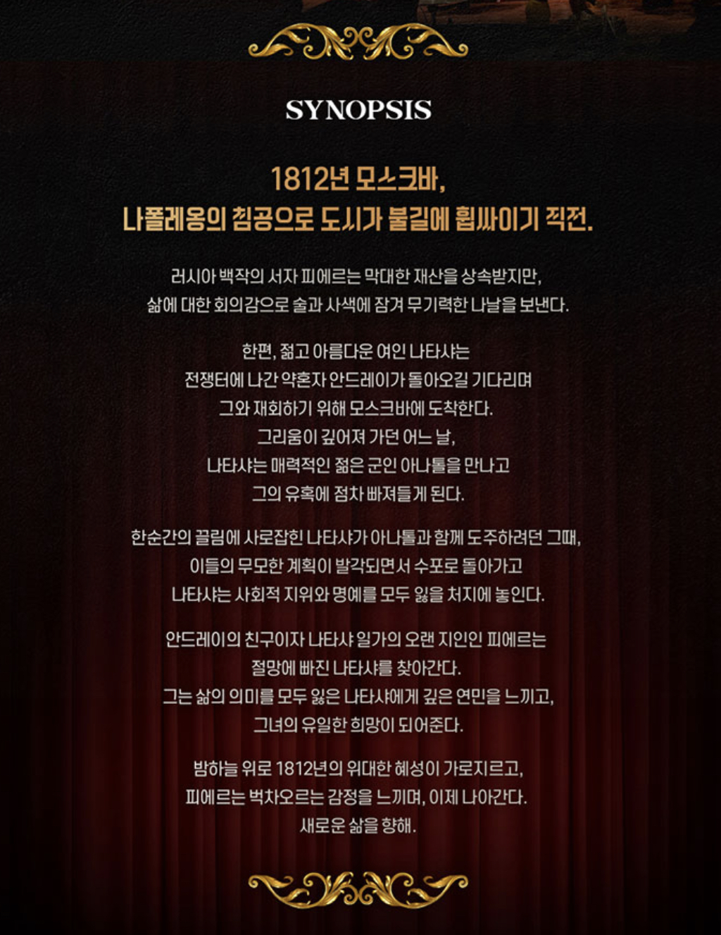 배경은 1812년 모스크바, 불길에 휩싸이기전 도시입니다. 피에르, 나타샤, 아나툴의 등장인물들의 사랑, 연민, 우정 등을 보여줍니다.