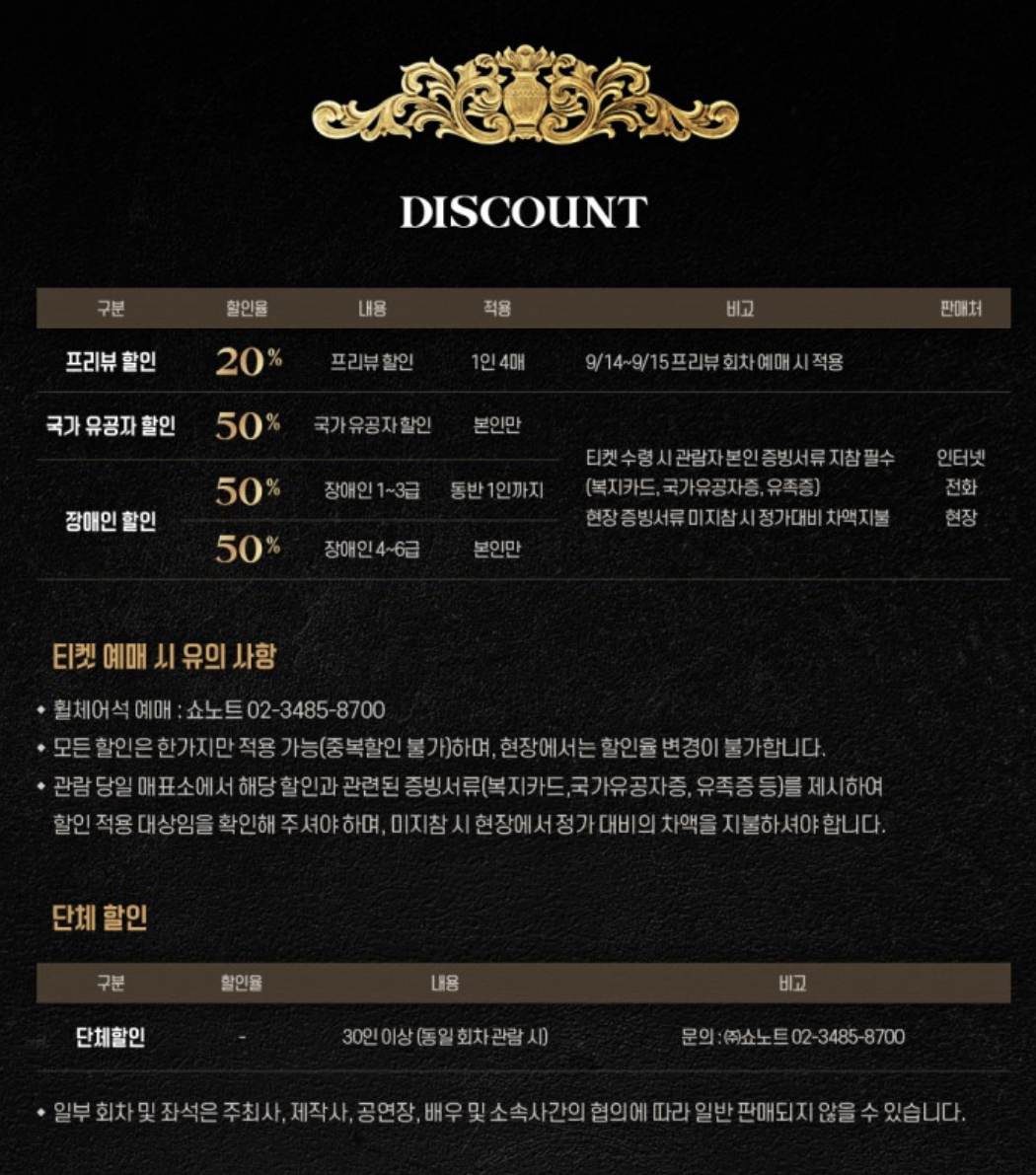 그레이트코멧 예매시 프리뷰할인 20%, 국가유공자할인, 장애인할인 등을 이용 할 수 있으니 해당되시는 분들은 잊지마시구요.