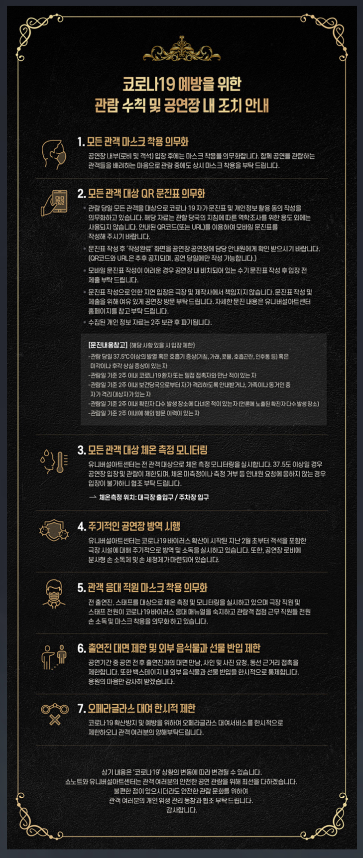 그래서 모든 관객 마스크착용 의무이고 큐알코드입장입니다. 체온측정도 당연하구요!