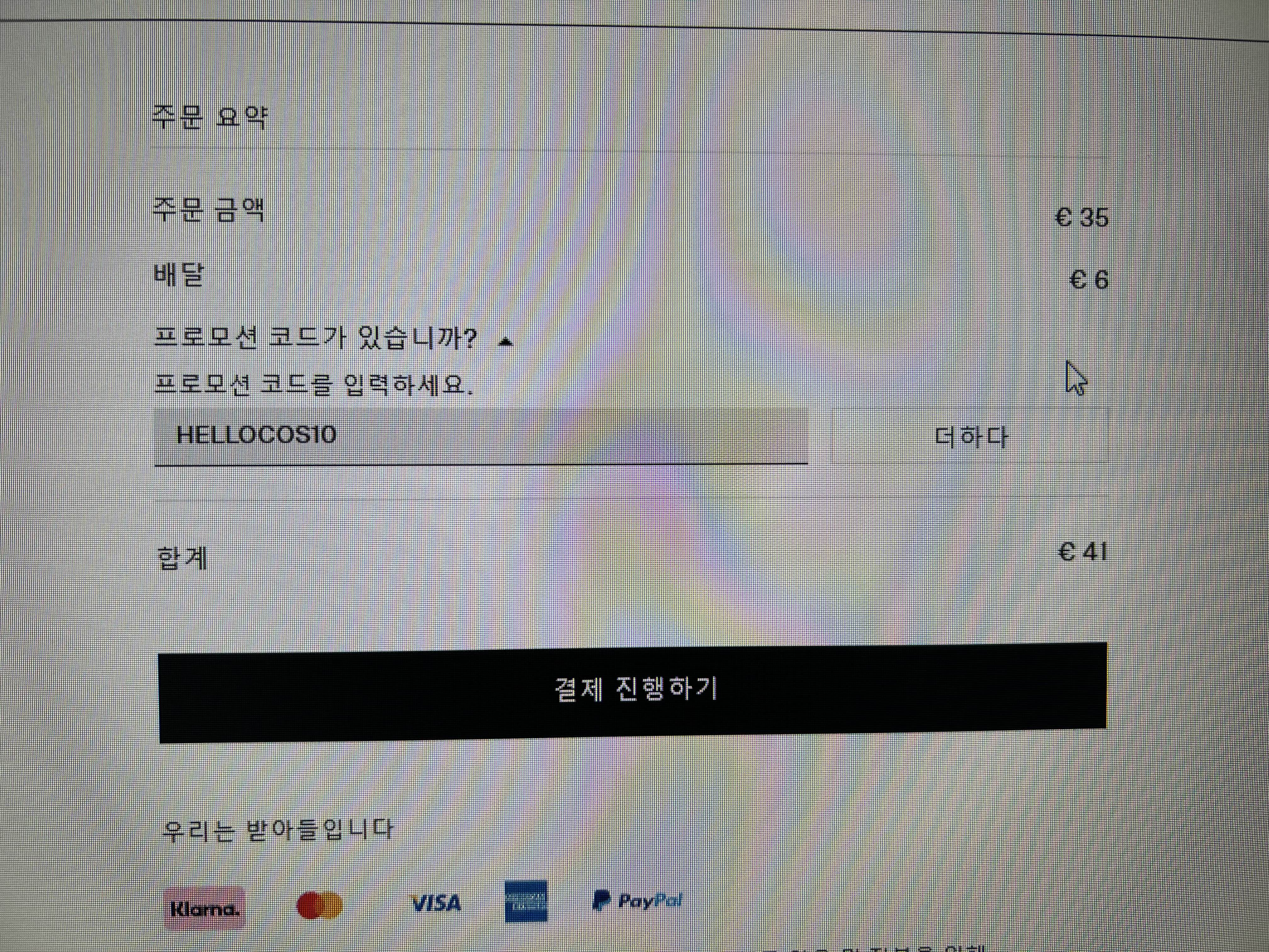 상품을 장바구니에 넣고 결제 전 코드입력란이 있으니 거기에 이 할인코드를 적어주면 10% 할인이 되고, 거기에 배송비가 붙어서 최종 가격이 나와요.