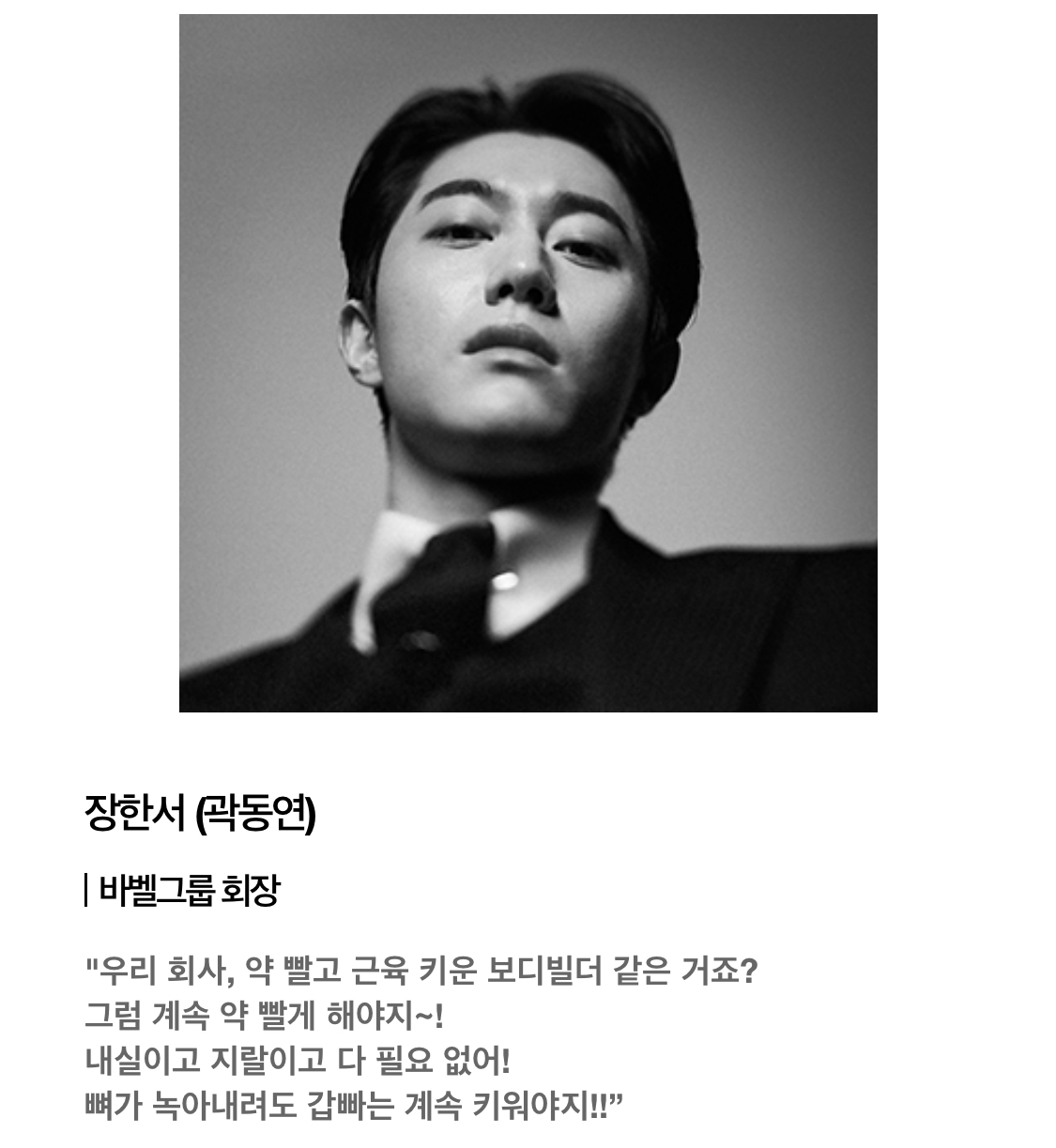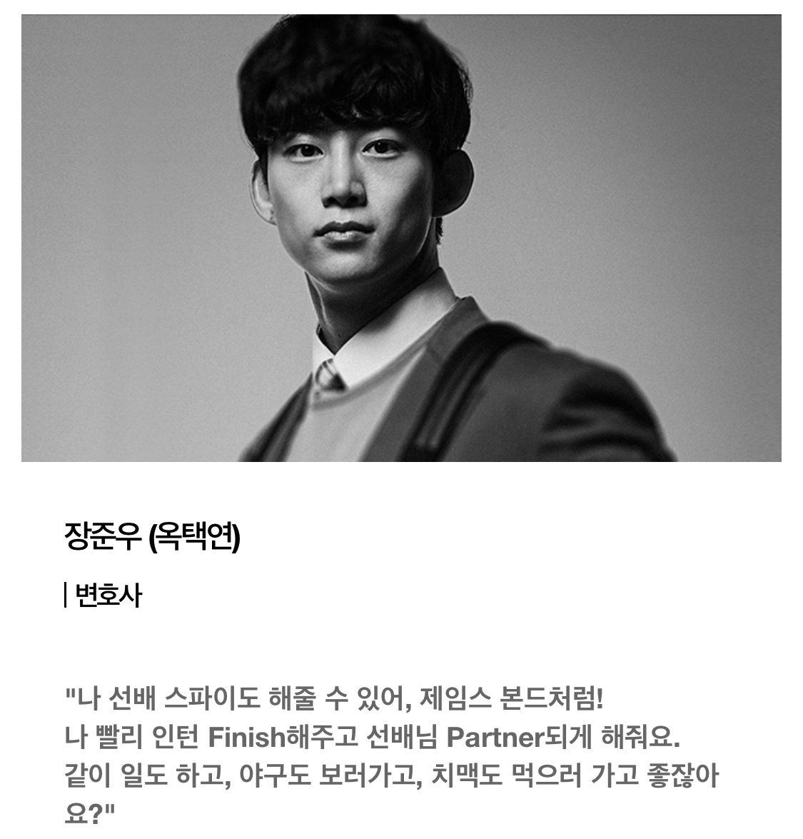 그리고 옥택연님은 법무법인(우상)의 신입 인턴 변호사로 나오는데 유학파 출신으로 말이 짧은 청년이지만 선배이자 사수인 홍차영에게 직진하는 인물이라고 해요. 너무 순수할것 같은 스냅사진과는 다르게, 인물설명에 보니 빈센조의 등장으로 일과 사랑 모두 삐걱대드는걸 느끼고 그걸 다시 되돌려놓으려 한다고 되있더라구요.