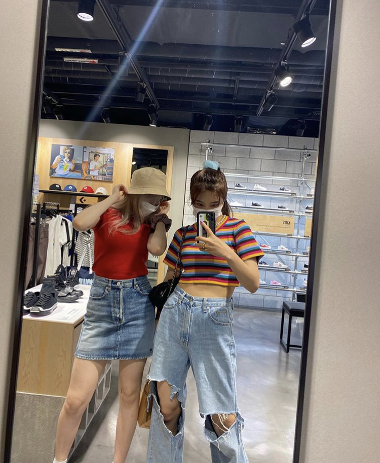 무지개색 크롭탑, 찢어진 통큰 청바지, 키치해보이는 악세사리와 곱창헤어밴드를 한 레벨 멤버 조이와 그 옆엔 똑같이 빈티지한 레드로 멋을 낸 여자친구 멤버 예린양이 함께 한 사진은 네티즌들의 갑론을박을 만들어냈습니다.