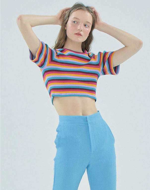 색상은 두가지가 있더라구요. 빈티지하고 레트로한 느낌이 드는 크롭탑으로 옛날 80년대 미국의 하이틴 사진 속에 나올 것 같은 옷입니다. 레인보우 스트라이프는 쨍한 원색 조합이라서 이런 감성이 느껴질 수 있나봅니다.