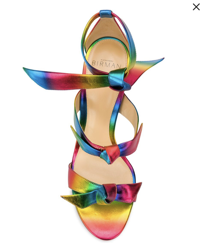 샤이니한 레인보우 색에 리본스트랩 3줄이 인상적인 슈즈는 alexandre birman 제품입니다.