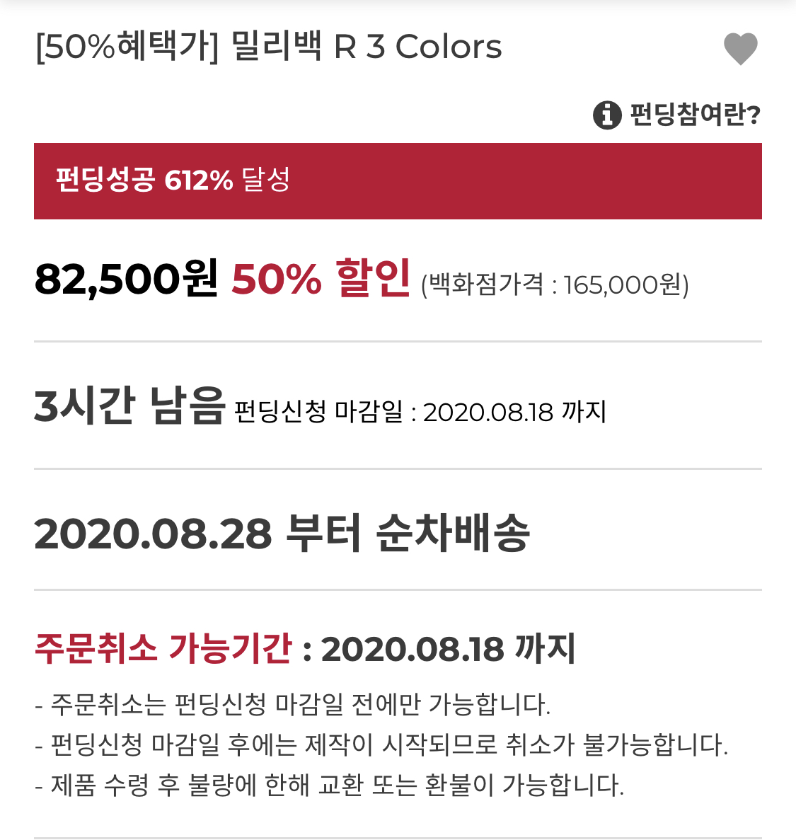 밀리백의 경우도 정가 174000원인데 펀딩가는 87000원이고, R은 82000원이에요.