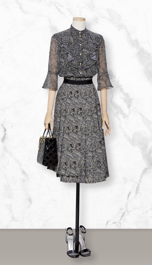 정갈한 테일러드라인과 스커트플리츠, 투피스 모두 격식을 갖추어야 될 자리에서 최고의 선택이 될 듯 해요.