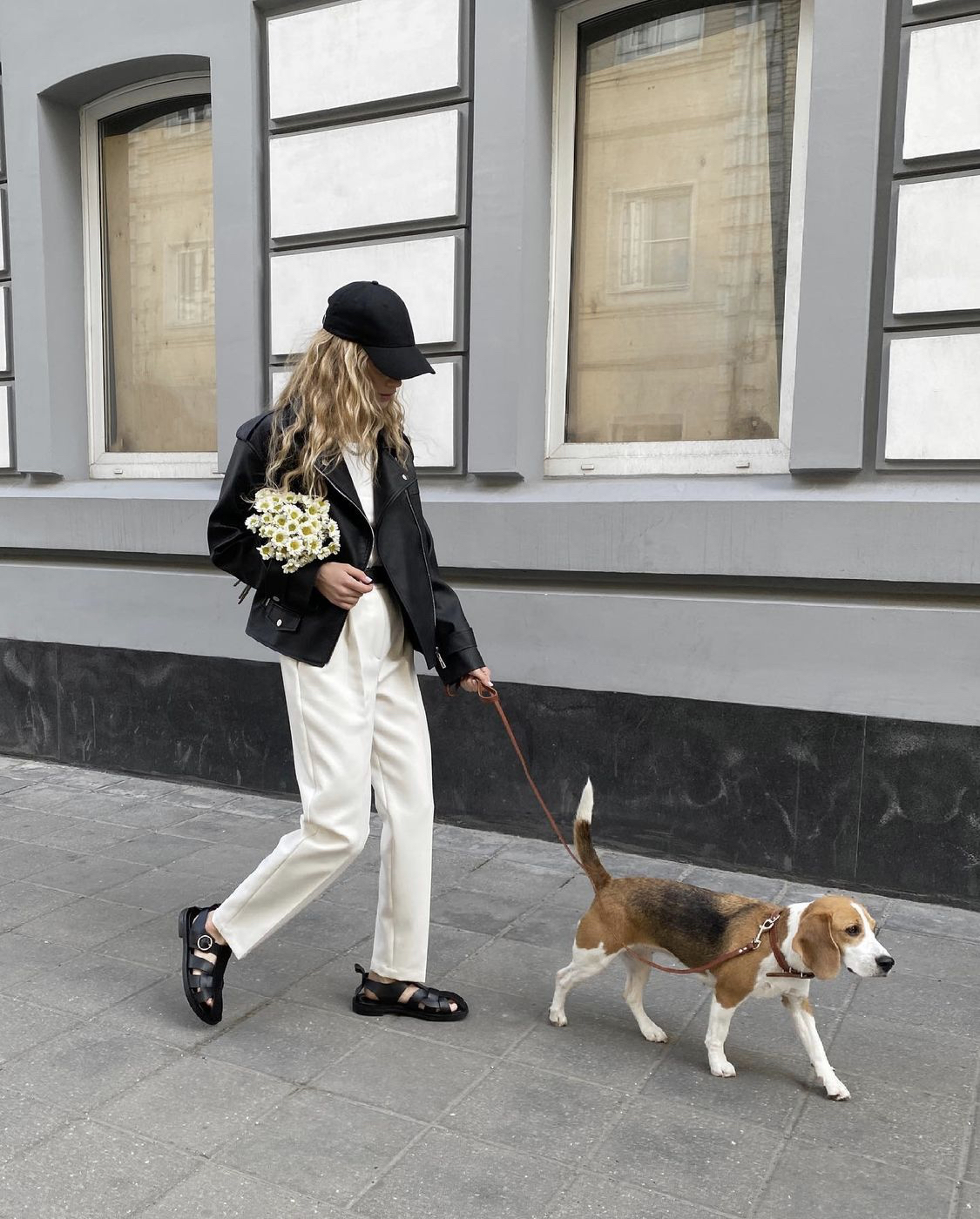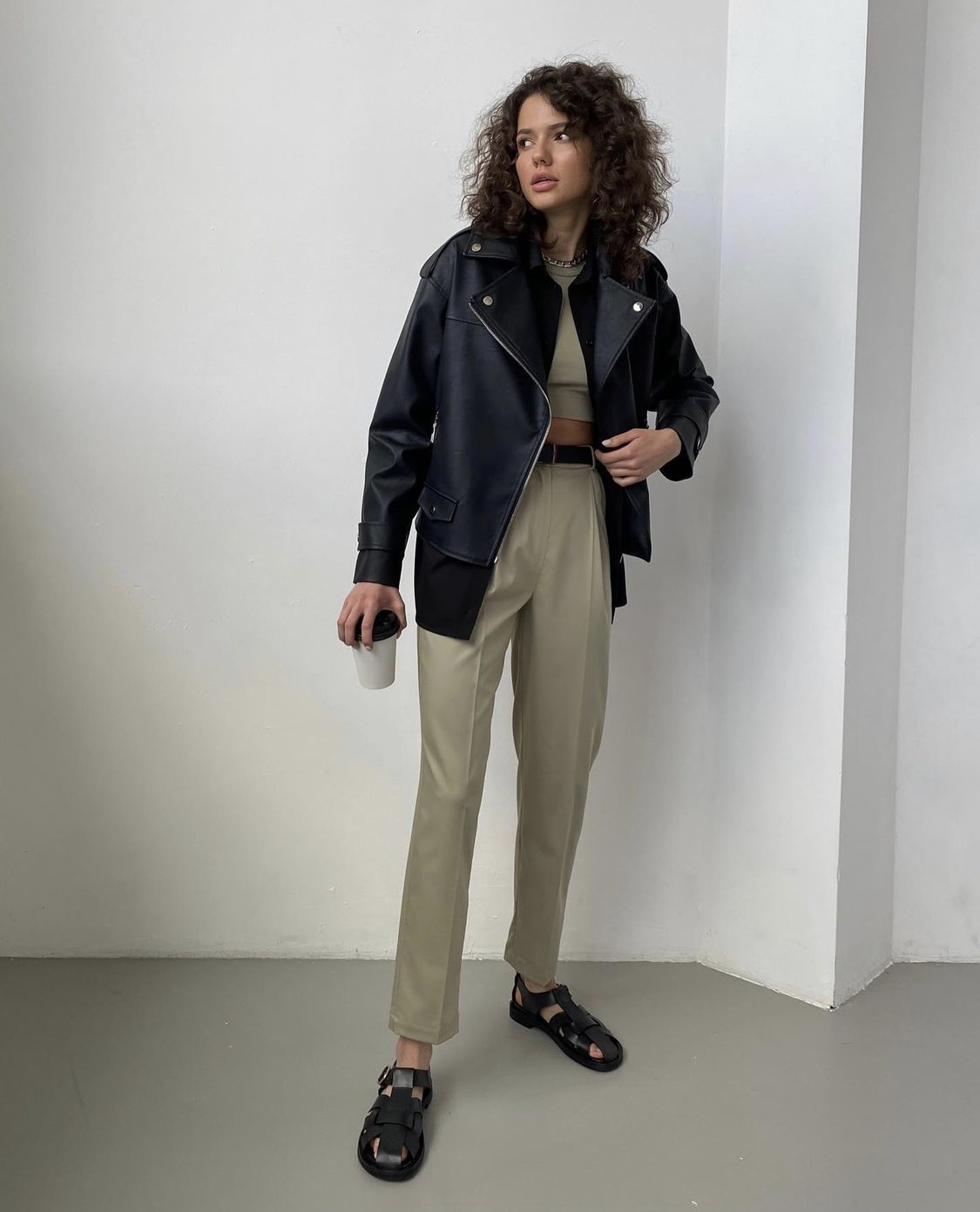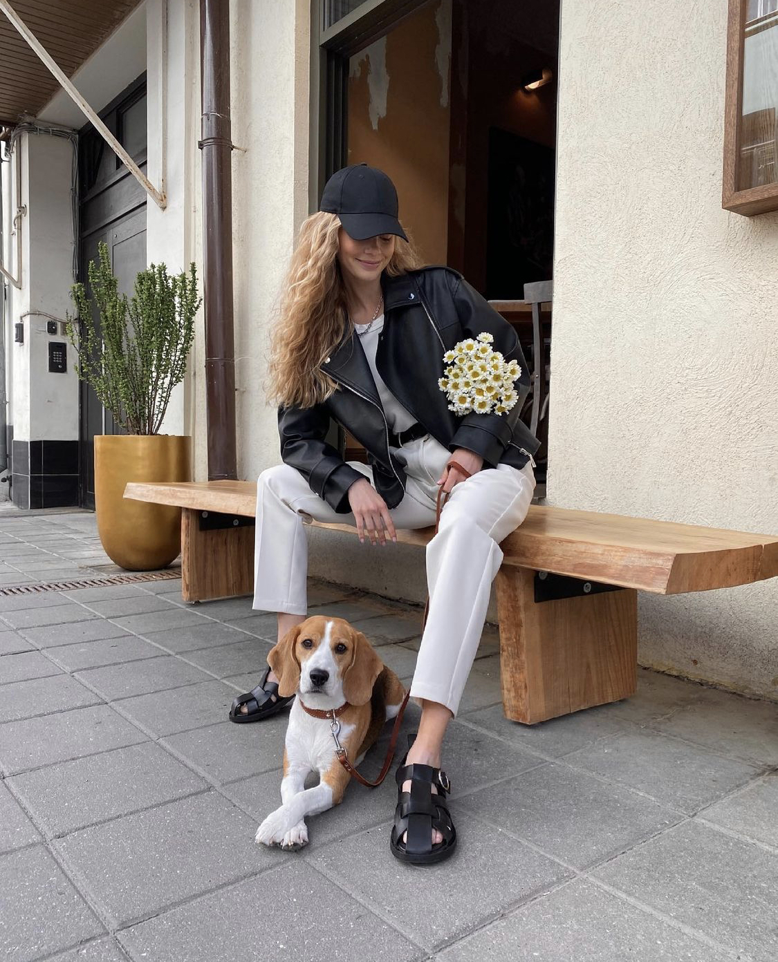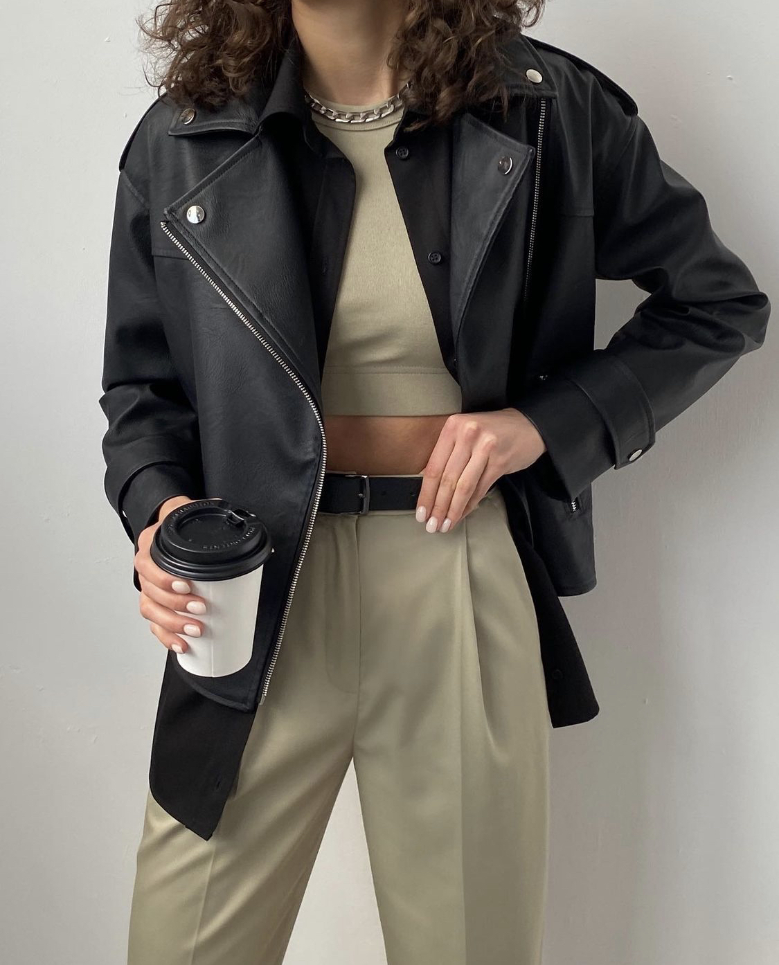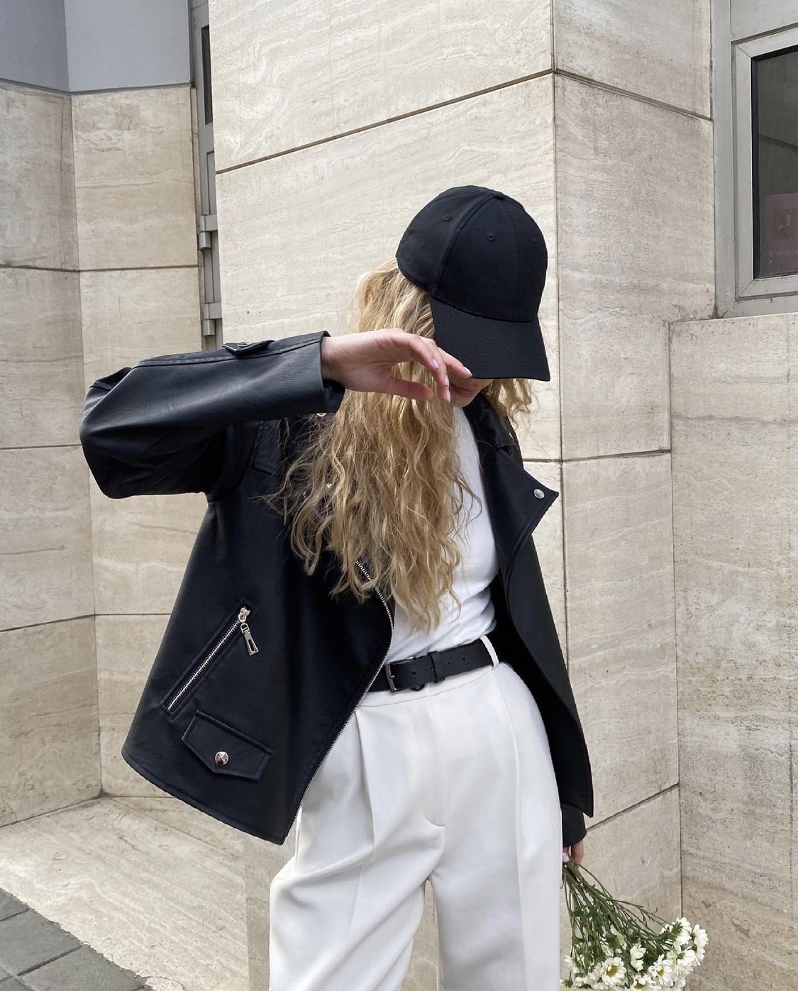 블랙의 심플하면서 디테일이 있을건 다 있는 가죽자켓과 밝은 아이보리빛 팬츠의 조화!
