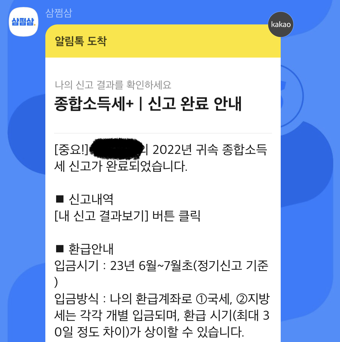 삼쩜삼에서 알아서 최종 신고를 다 마친 뒤, 5월 29일 카톡이 왔어요.