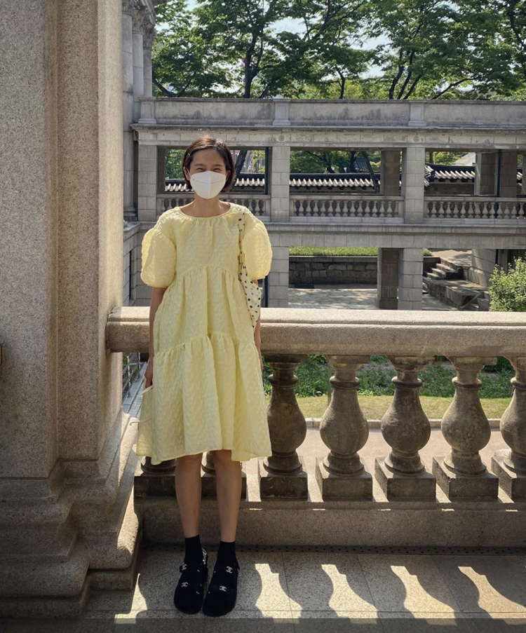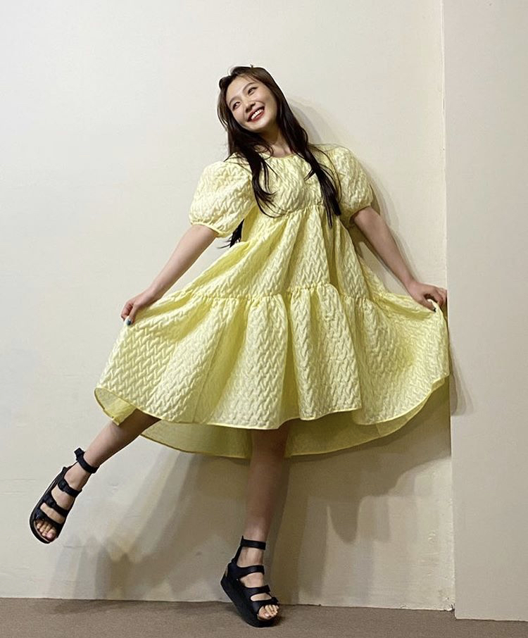 따뜻한 노란 컬러와 디테일이 소녀스럽고 사랑스럽네요. 스트랩샌들과 함께 코디하니 확실히 캐쥬얼하면서 러블리한 느낌이 납니다.😍