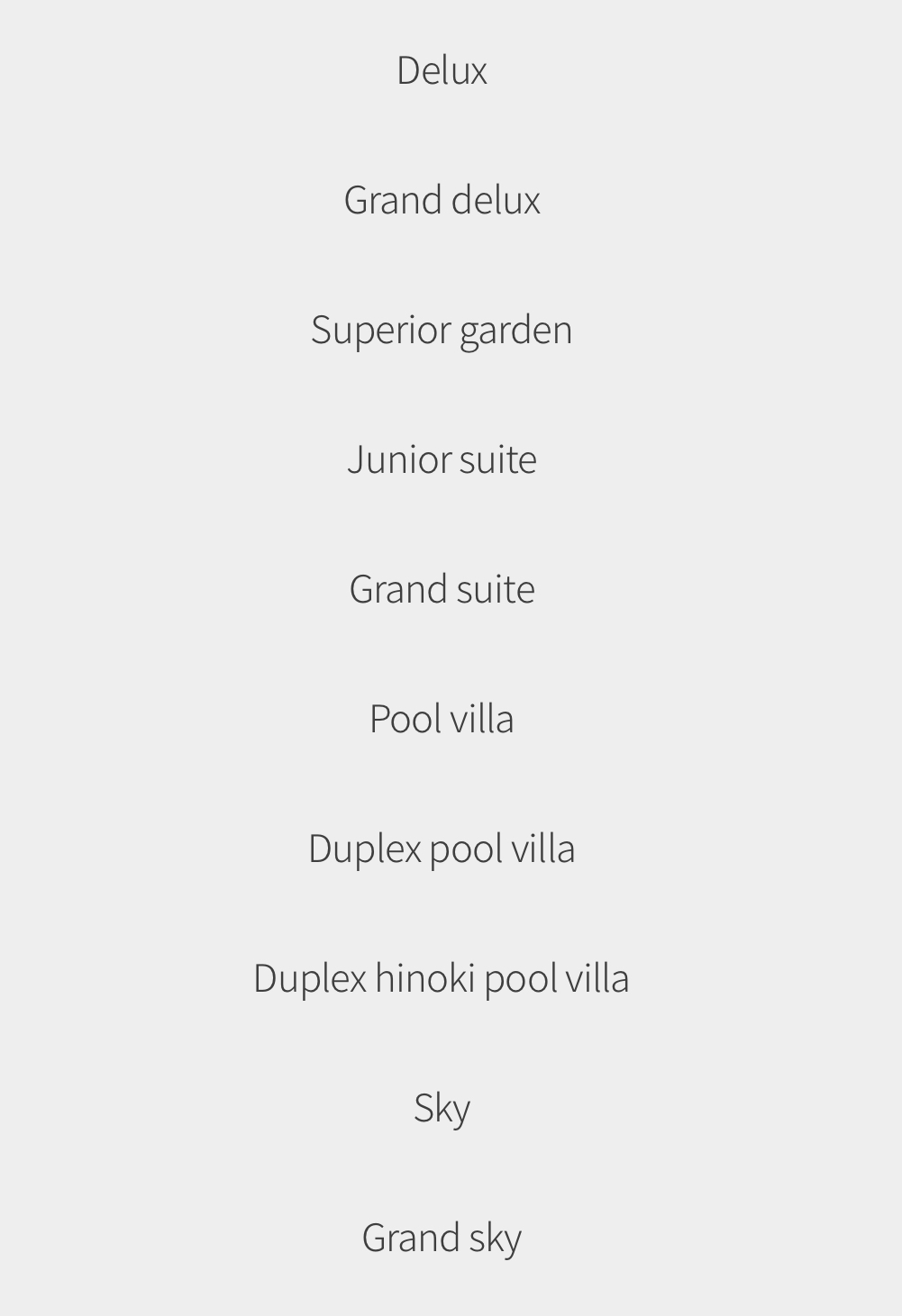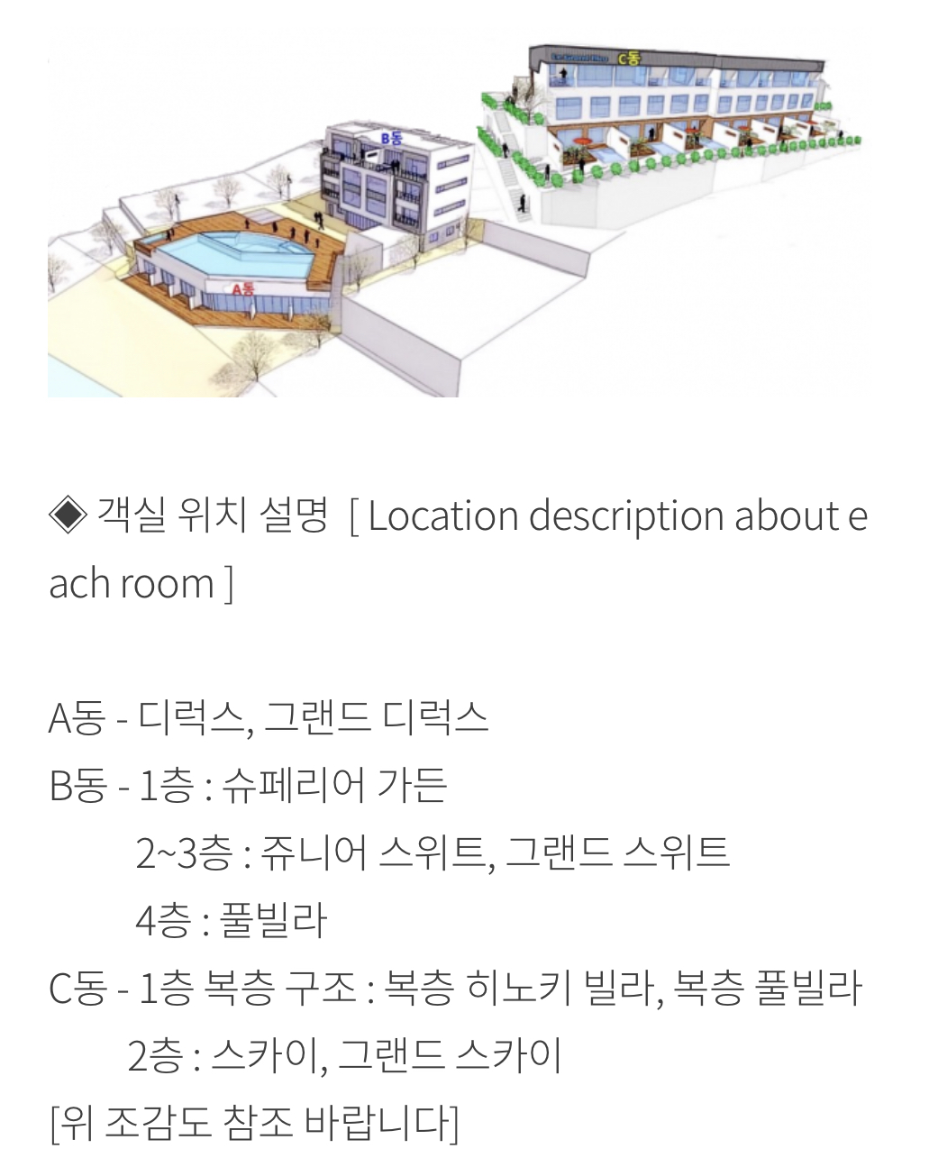 디럭스, 그랜드디럭스, 수페리어가든, 주니어스위트, 그랜드스위트, 풀빌라, 디럭스풀빌라, 디럭스히노끼풀빌라, 스카이, 그랜드 스카이 이렇게 나뉘구요. 객실의 위치는 위 그림을 참고해주세요.