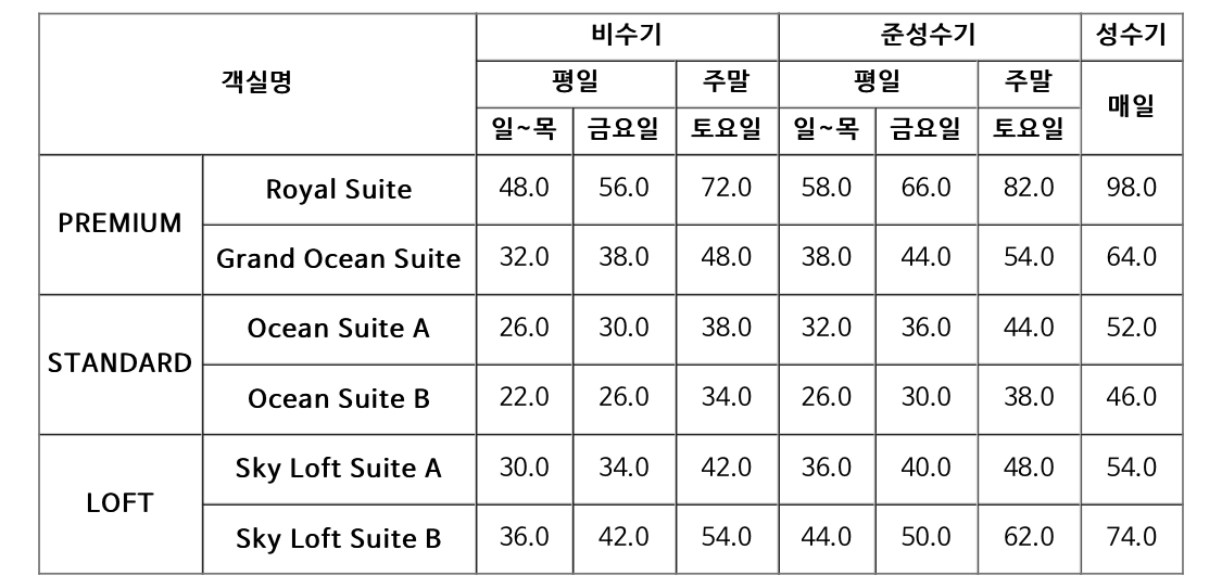 로얄스위트, 그랜드 오션스위트, 오션스위트A,오션스위트B, 스카이로프트 스위트 A, 스카이로프트 스위트B 이렇게 있습니다.