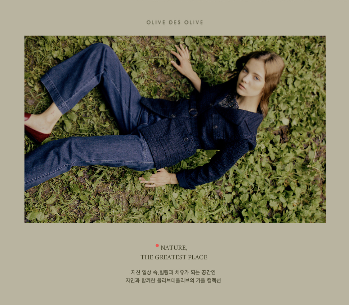 올리브데올리브의 이번 가을 컬렉션 테마는 자연 속 패션이였나봐요. 힐링의 공간, 숲을 테마로 해서 자연스러운 스타일을 살리는 디자인을 많이 한 것 같습니다.