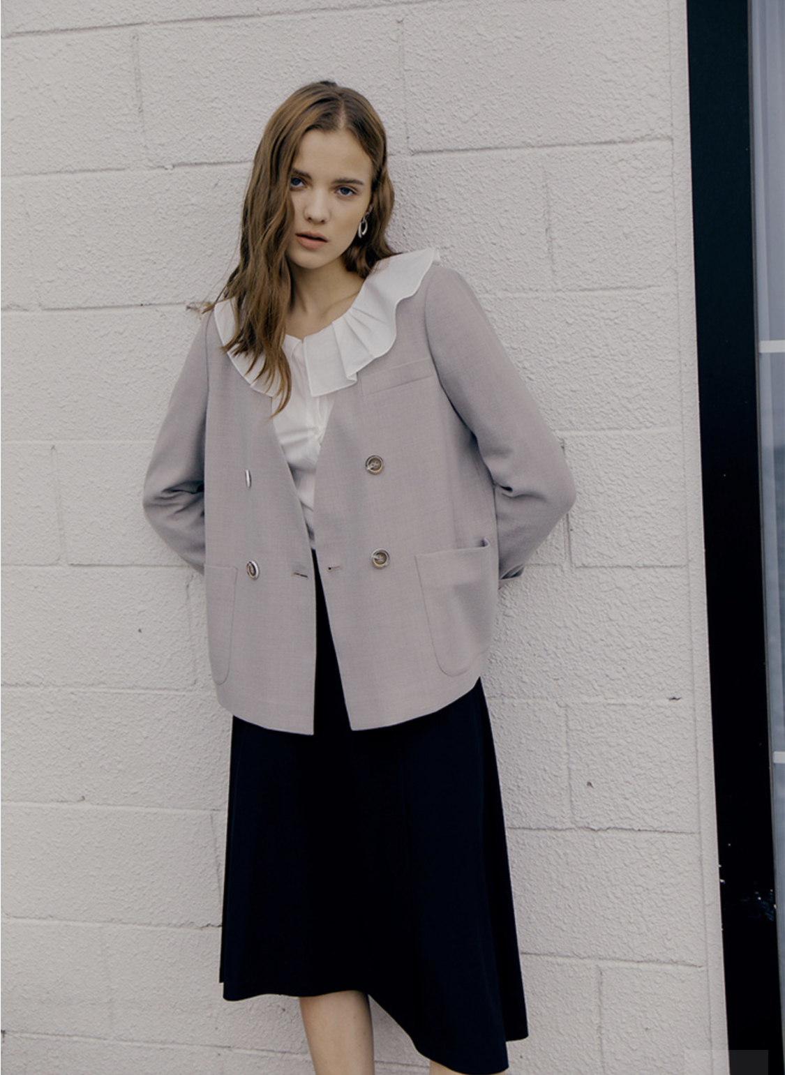 아무데나 툭 걸쳐 입어도 예쁠 심플한 노카라자켓과 그걸 받쳐주는 러플 블라우스, 그리고 블랙스커트의 색조합, 스타일링이 단순하면서 맘에 들어요❤️