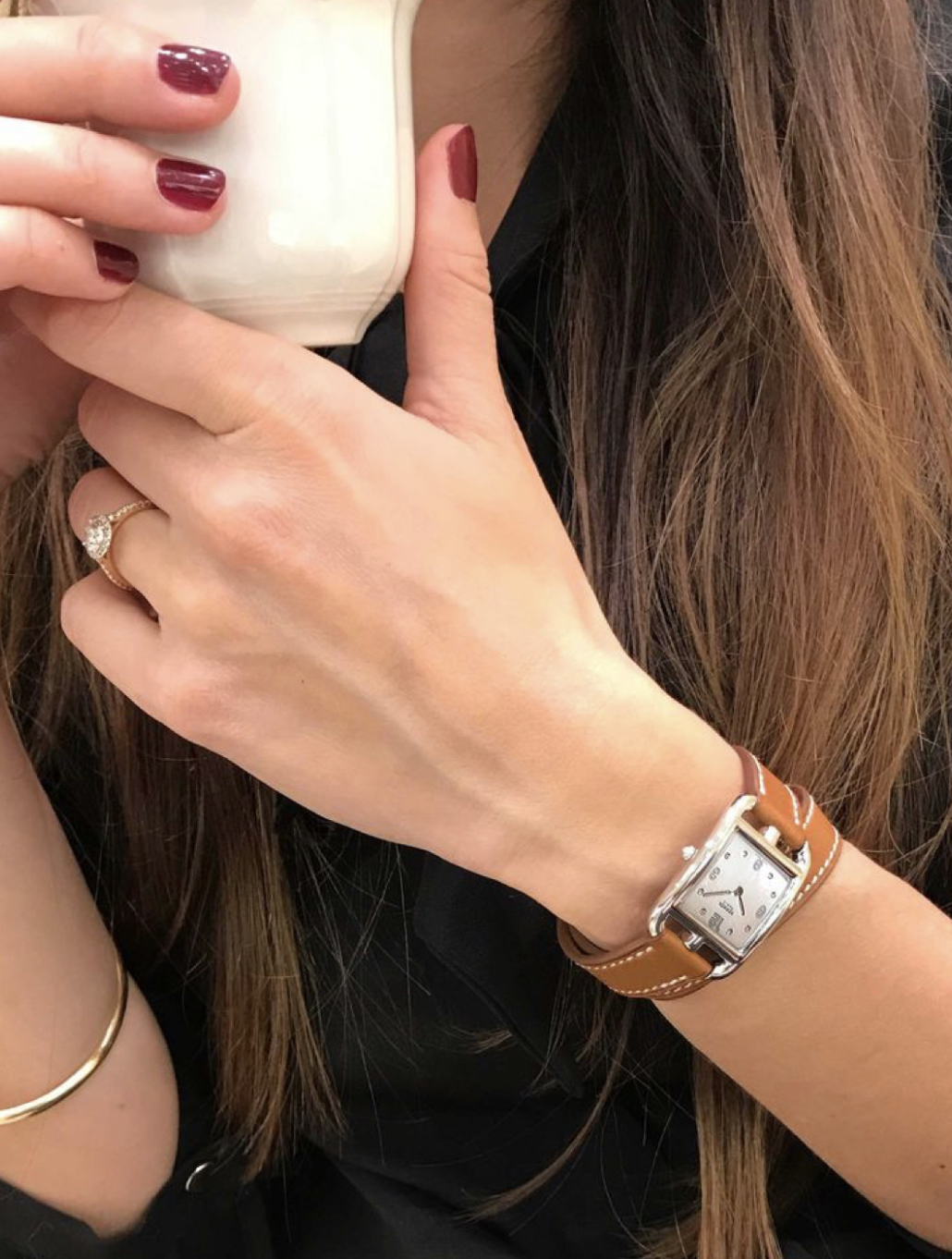 제가 에르메스 팔찌 사진을 보는중에 시계도 떴는데요. 이 사진 자체가 멋졌어요. 그러니까 에르메스 시계 팔찌와 골드 브레이슬릿, 다이아반지, 자주색 네일, 갈색머리, 블랙상의 이 조합이 미쳤다고 생각되더라구요 ㅜㅜ