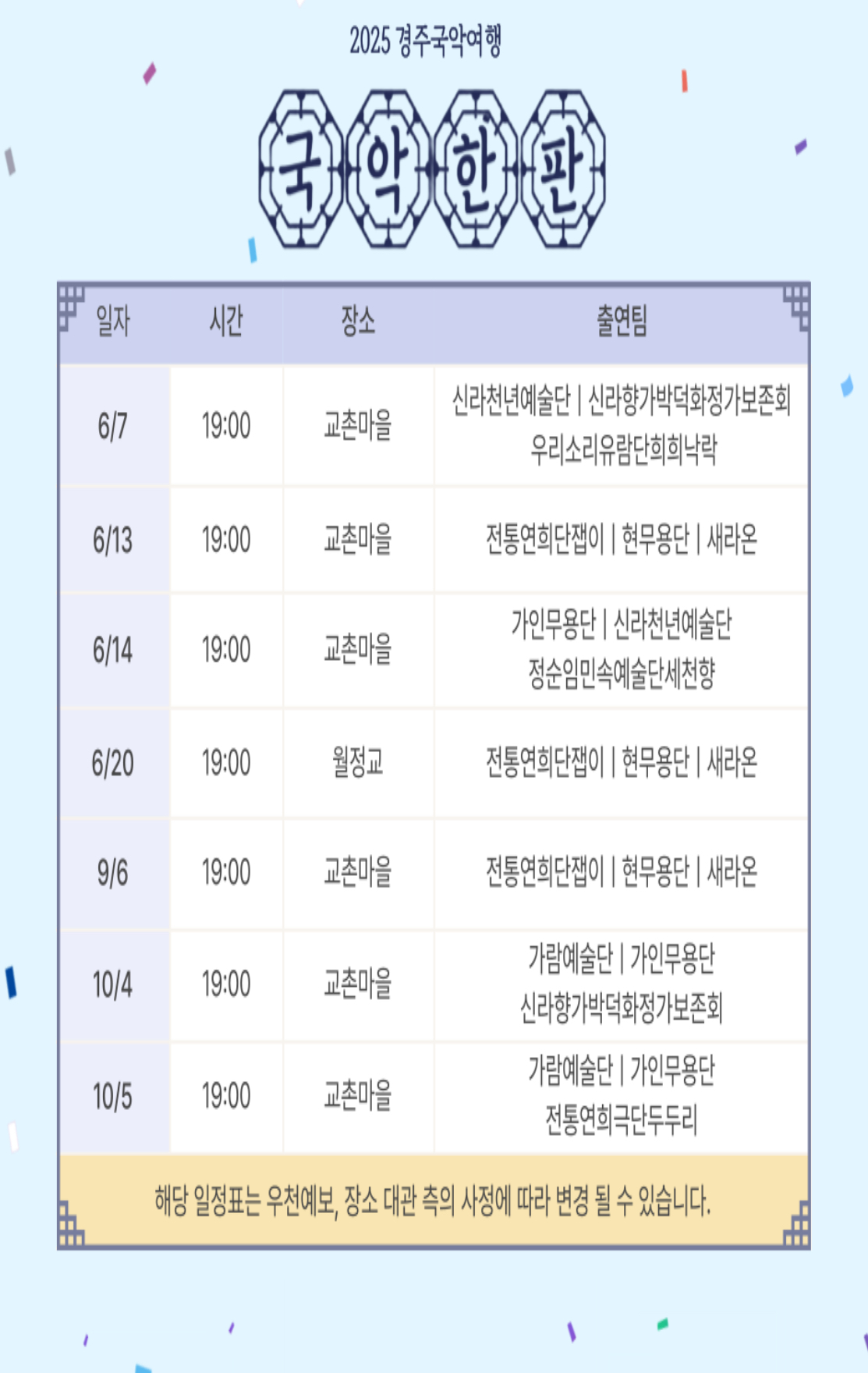 9월 6일, 10월 4일, 10월 5일 밤 7시 경주 교촌마을에서 국악한판 공연이 열립니다.