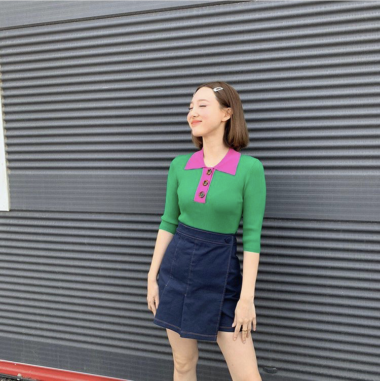 컬러풀한 그린,핑크 썸머니트와 스커트, 그리고 똑단발이 함께 어우러진 코디 스타일인데요.