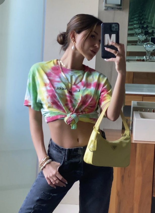 너무너무 상큼하지 않나요? 여러가지로 염색된 티셔츠를 짧게 묶어 올려 크롭탑 느낌을 내고, 찢청바지를 입고, 자연스럽게 묶은 머리에 레몬색 호보백을 똭!