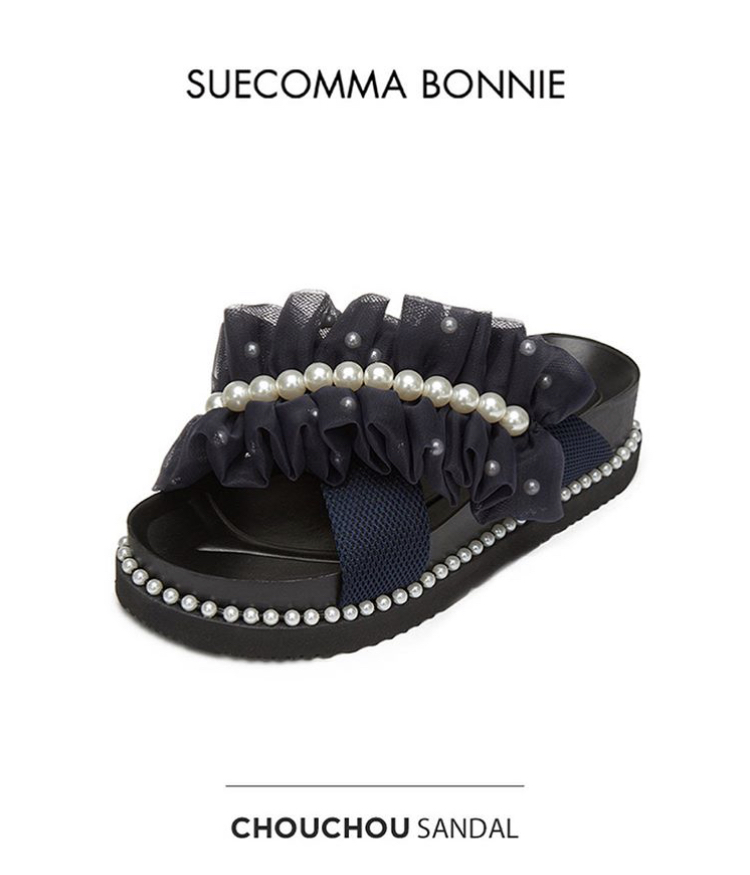 망사원단, 진주알 등으로 페미닌한 느낌을 듬뿍 살린 슈콤마보니의 슬리퍼 샌들이에요.