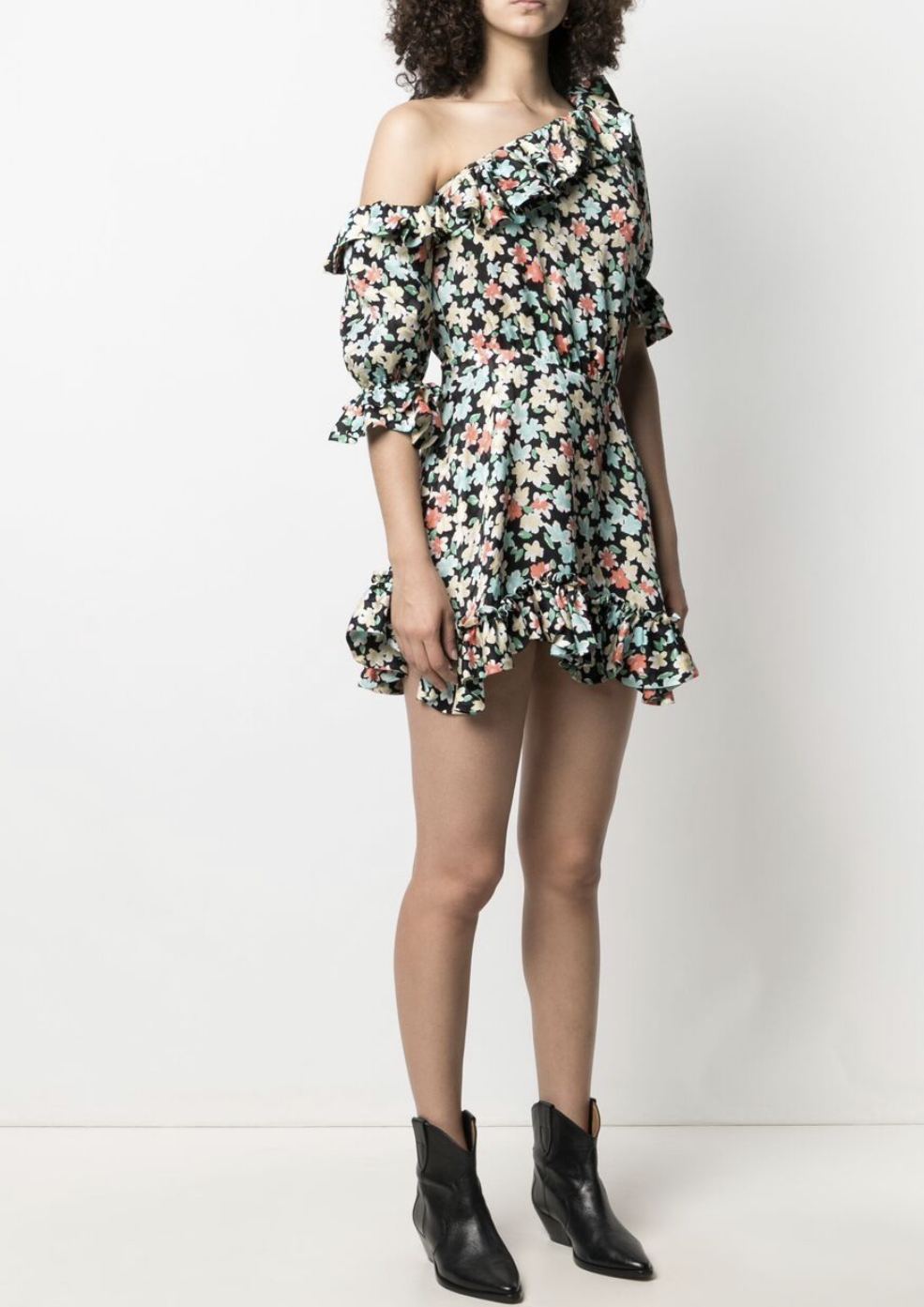한예슬님이 제주도 푸른 초원에서 입었던 오프숄더형 미니 원피스는 생로랑 원숄더 벌룬 소매 플로럴 프린트 드레스입니다^^