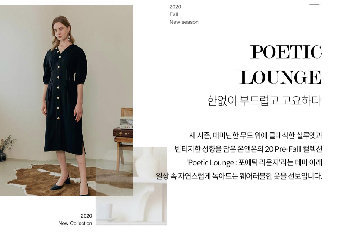온앤온은 한없이 부드럽고 고요하다 라는 이번 시즌 타이틀에 딱 맞는 브랜드에요. 온앤온은 이 시대 여성들이 정말 자주 즐겨입을만한 데일리룩을 보여주는 패션브랜드인데요. 그렇다고 개성이 없는 것도 아니고, 정말 취향저격템이 많은!! 여성스러운 데일리룩을 보여주는 핫 브랜드랍니다.