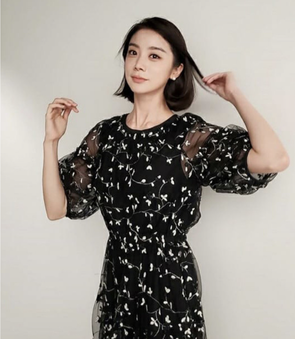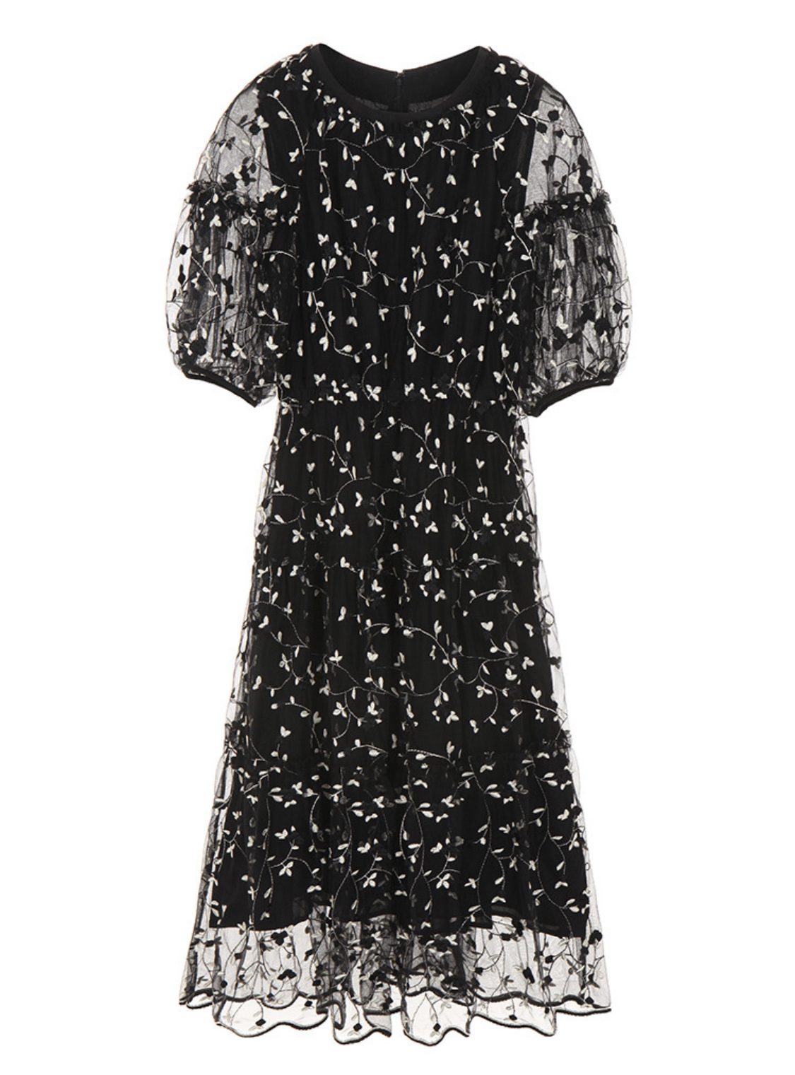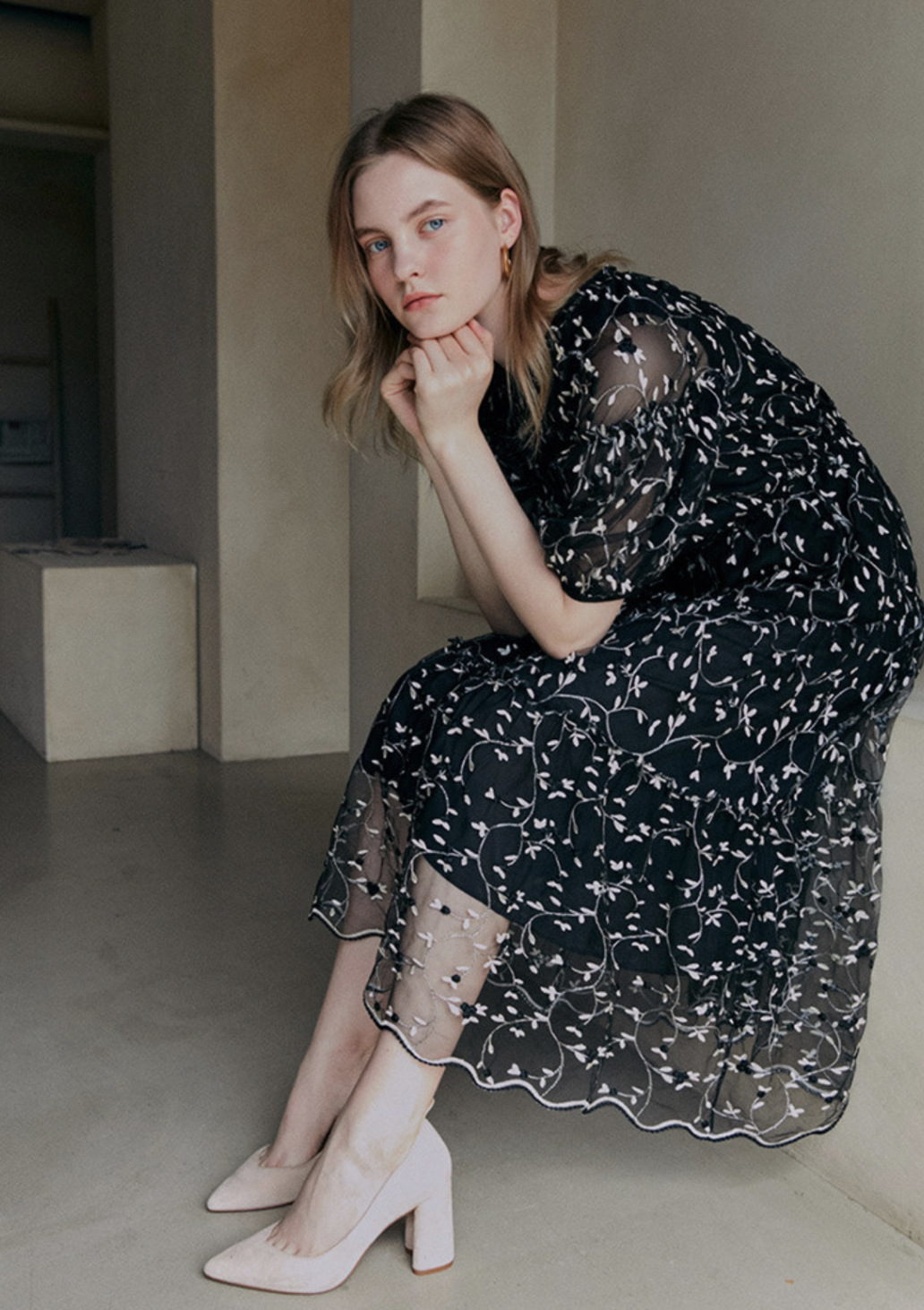 그리고 혜림에게 찰떡 같이 어울리는 시스루 원피스 또한 문의가 많았던걸로 알아요. 잔잔한 꽃무늬와 강렬한 블랙시스루의 만남! 진짜 진짜 근사한 이 원피스는 자수 튤 원피스랍니다.