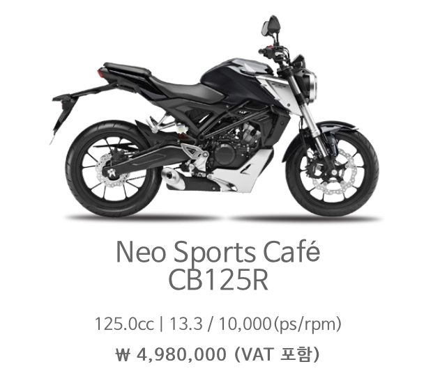 혼다오토바이 모델 중 125cc 이하는 SCR110알파, Benly 110, super cub, msx125, pcx, elite, 네오스포츠카페cb125r, c125 모델이 있습니다.